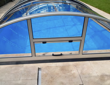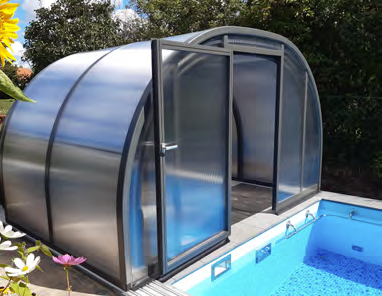 The roof surfaces and end walls are made of either 8 mm thick twin-wall sheets or crystal-clear 4 mm thick massive sheets. We do not use cheaper SAN for the roof panels of the pool enclosures, but only the higher quality, extremely impact-resistant and absolutely shatterproof polycarbonate. It is virtually indestructible.