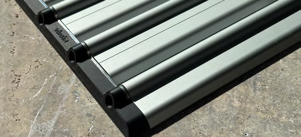 Superflache Laufschienen ermöglichen das sichere Schieben der Elemente. Die Laufschienen sind abgerundet und barfuß begehbar. Eine eingelassene Montage ist möglich. Die Laufschienen sind eloxiert oder auch in einer, an die Umrandung des Pools, angepassten Farbe erhältlich.