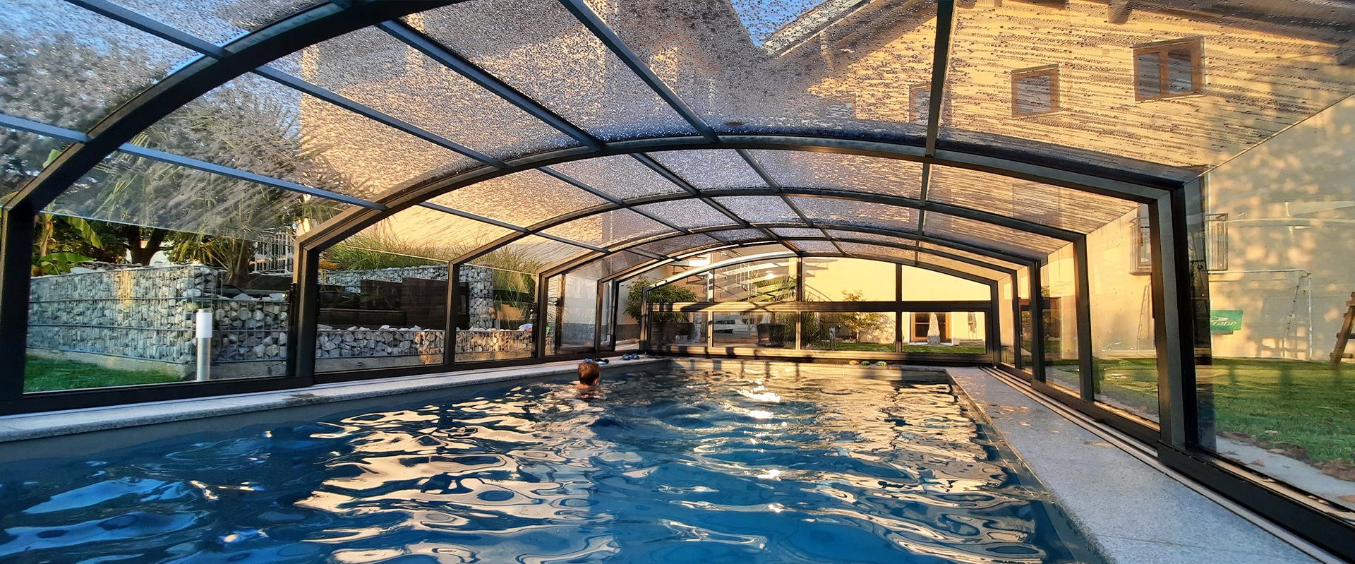 The design of the CARAT enclosure is designed for those who love angular shapes. The CARAT is characterized by its modernity and unique construction with transparent corners. The vertical sidewall design of this pool cover offers plenty of headroom and allows for the integration of any raised structure. It can be moved quickly and easily by just one person. Motorization is available as an option. With a pool enclosure, you not only reduce water loss through evaporation but also your cleaning effort.