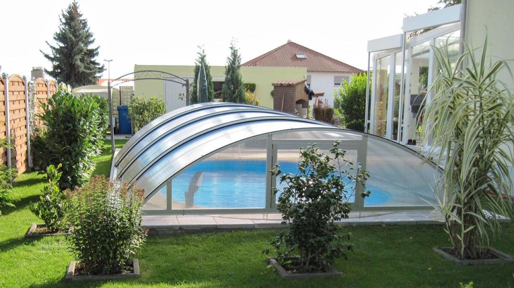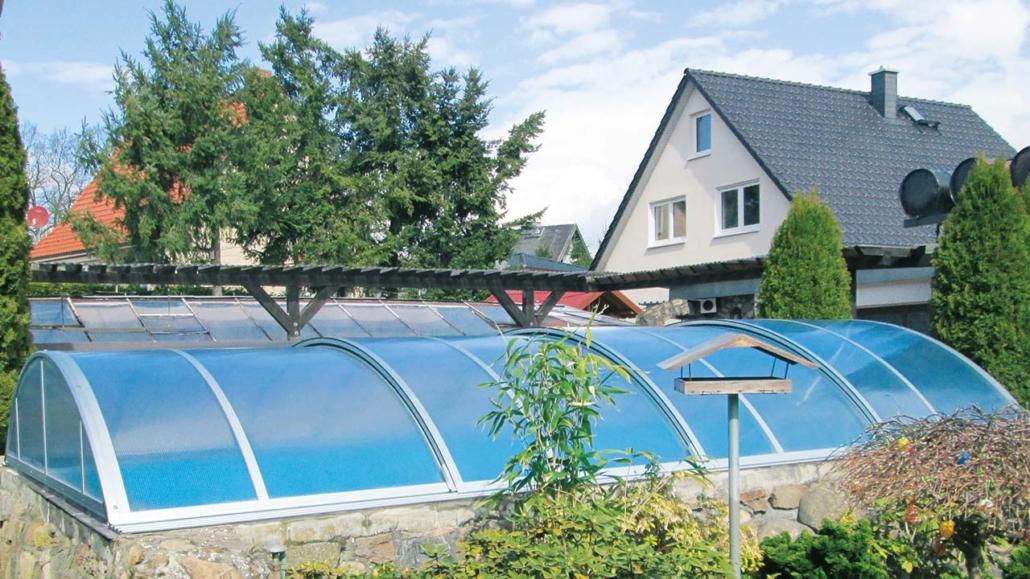The pool roof provides protection from accidents for children and pets. The specially developed wind protection and high-quality solid panels protect against wind and snow. The polycarbonate glazing is completely shatterproof and impact-resistant.