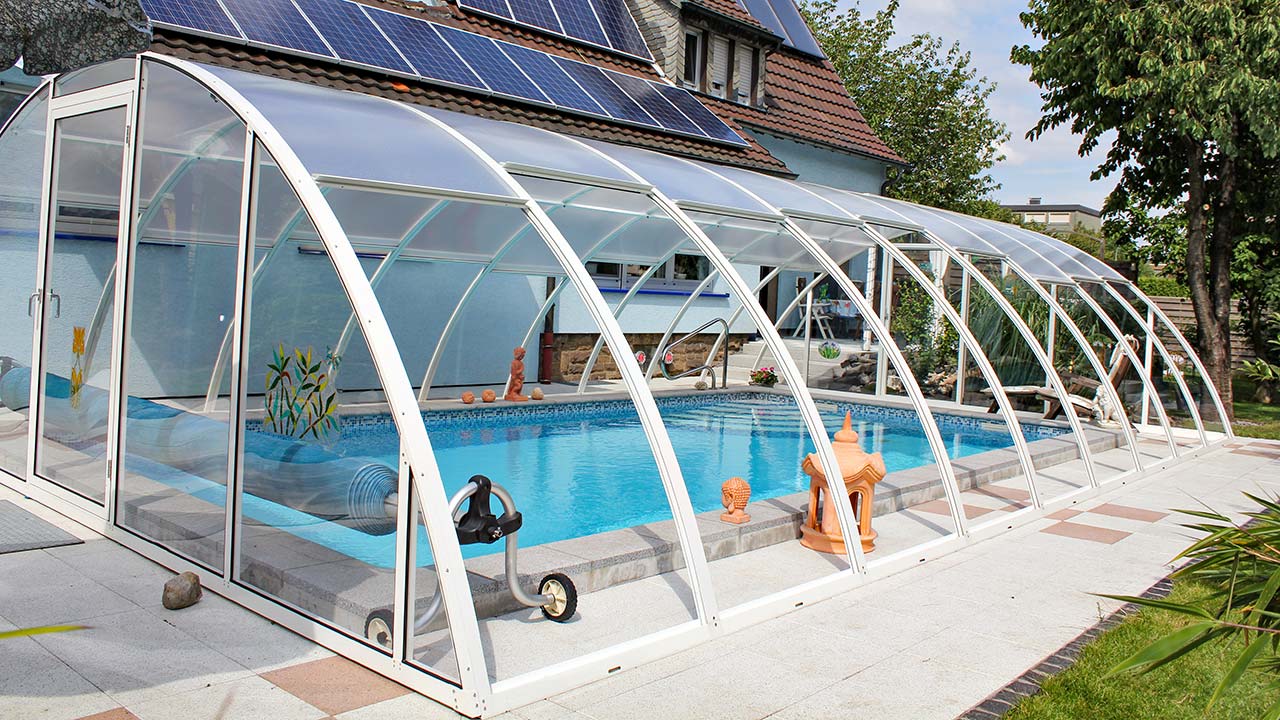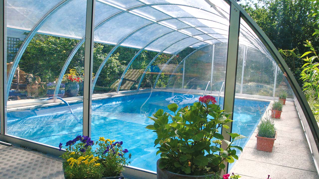 All roof panels of the pool enclosure can be raised independently of each other, providing the wind and privacy protection you need. The pool roof is constructed with twin-wall panels as standard. Upon request, the end walls are also available in plastic glass for an unobstructed view of your garden.