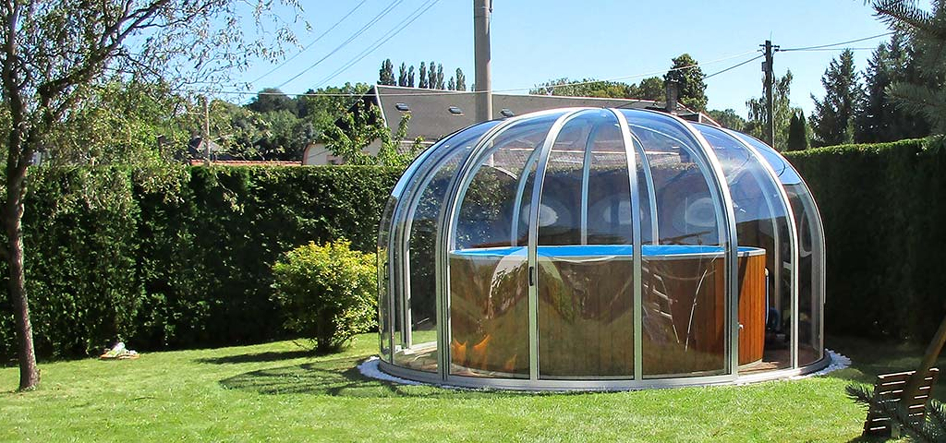 The freestanding dome design of the RUND spa roof offers optimal panoramic views of the garden and outdoor areas.
