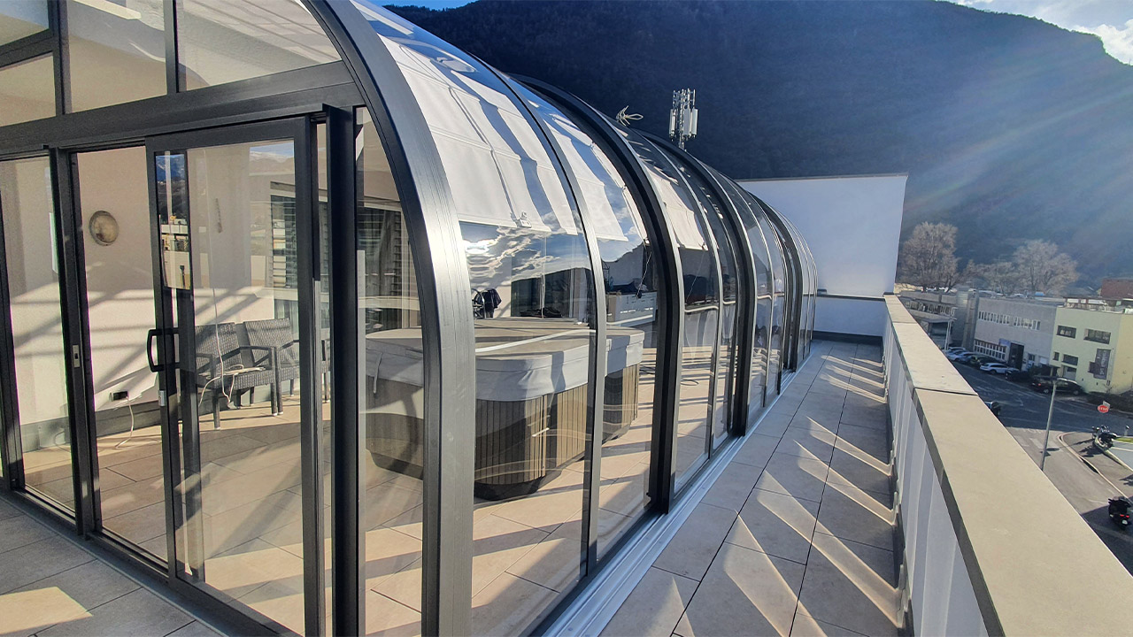 Enjoy all the benefits of the SAPHIR solar veranda in your spa area. The elements are completely transparent from floor to ceiling. Nothing prevents you from continuing to enjoy the view outside. In summer, the elements slide from the center to the sides, allowing for many pleasant hours of wellness under the open sky.