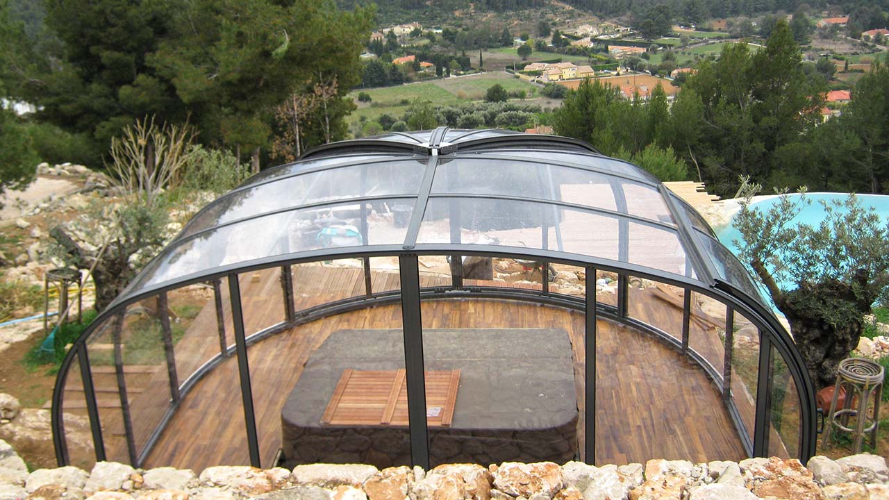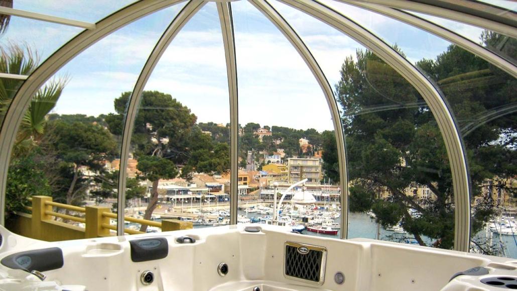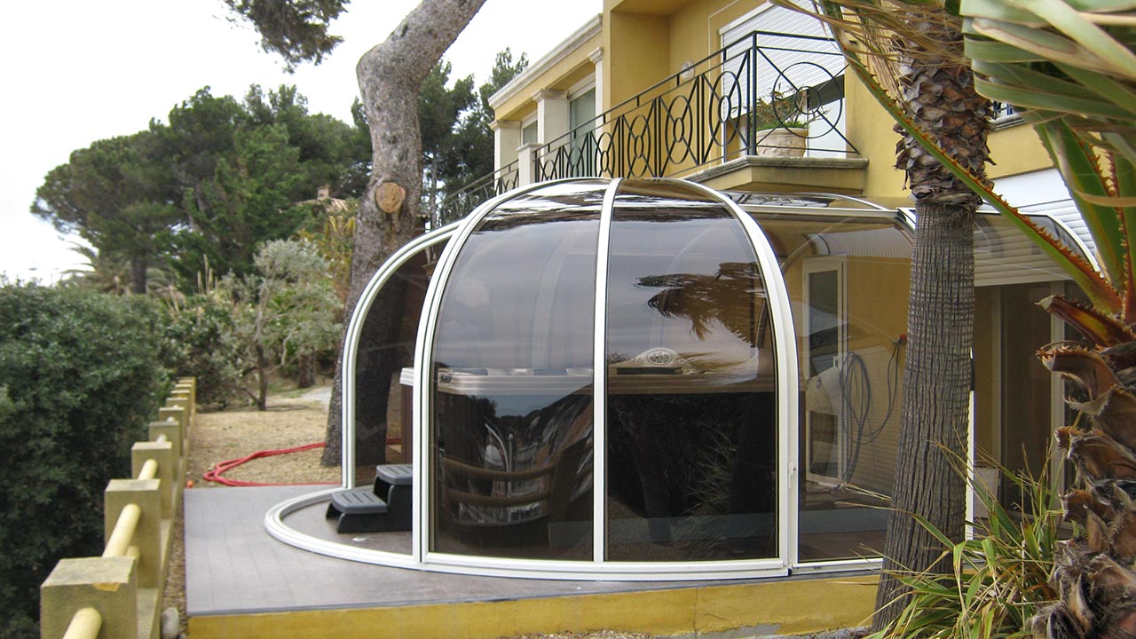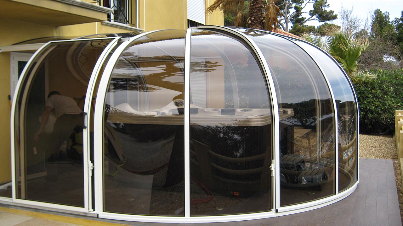 Relocate your vacation to your garden and relax under the enclosed whirlpool enclosure, even in inclement weather. With the sliding elements of the curved enclosure, you can enjoy your very own spa landscape outdoors in no time. Sliding doors on the sides or in the rear wall are possible, depending on the structural conditions.