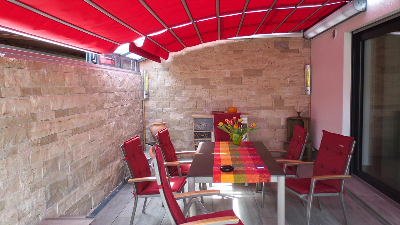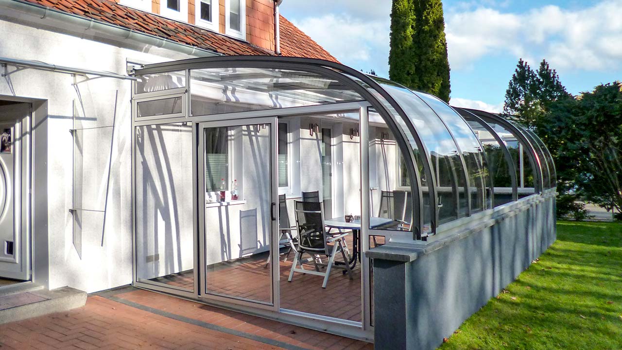 The terrace can be used in rain, wind, and sunshine. The sliding roof elements of the patio roof allow for quick response to changing weather conditions.