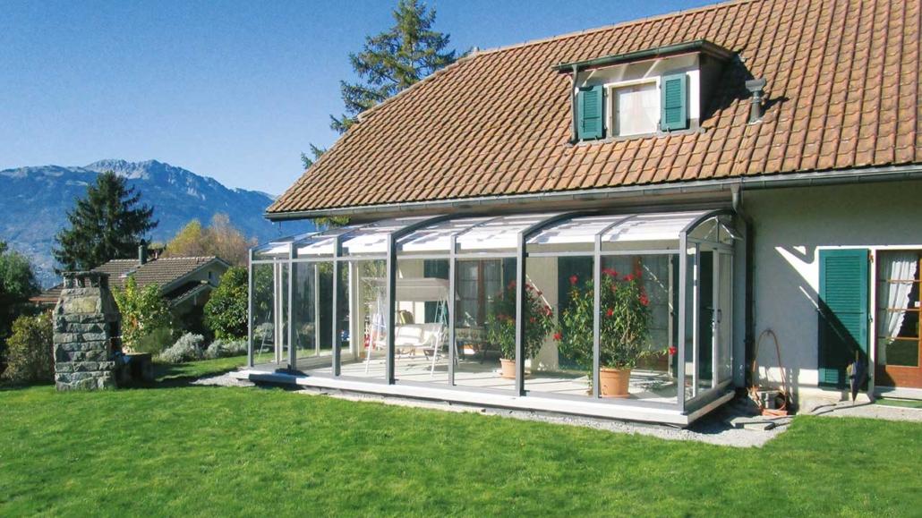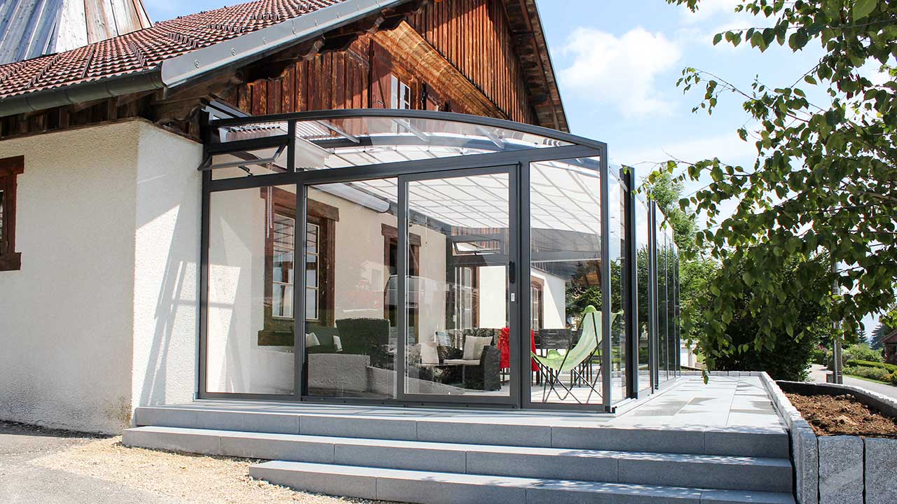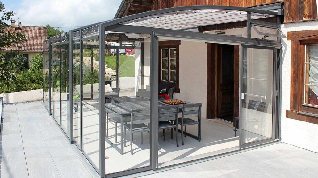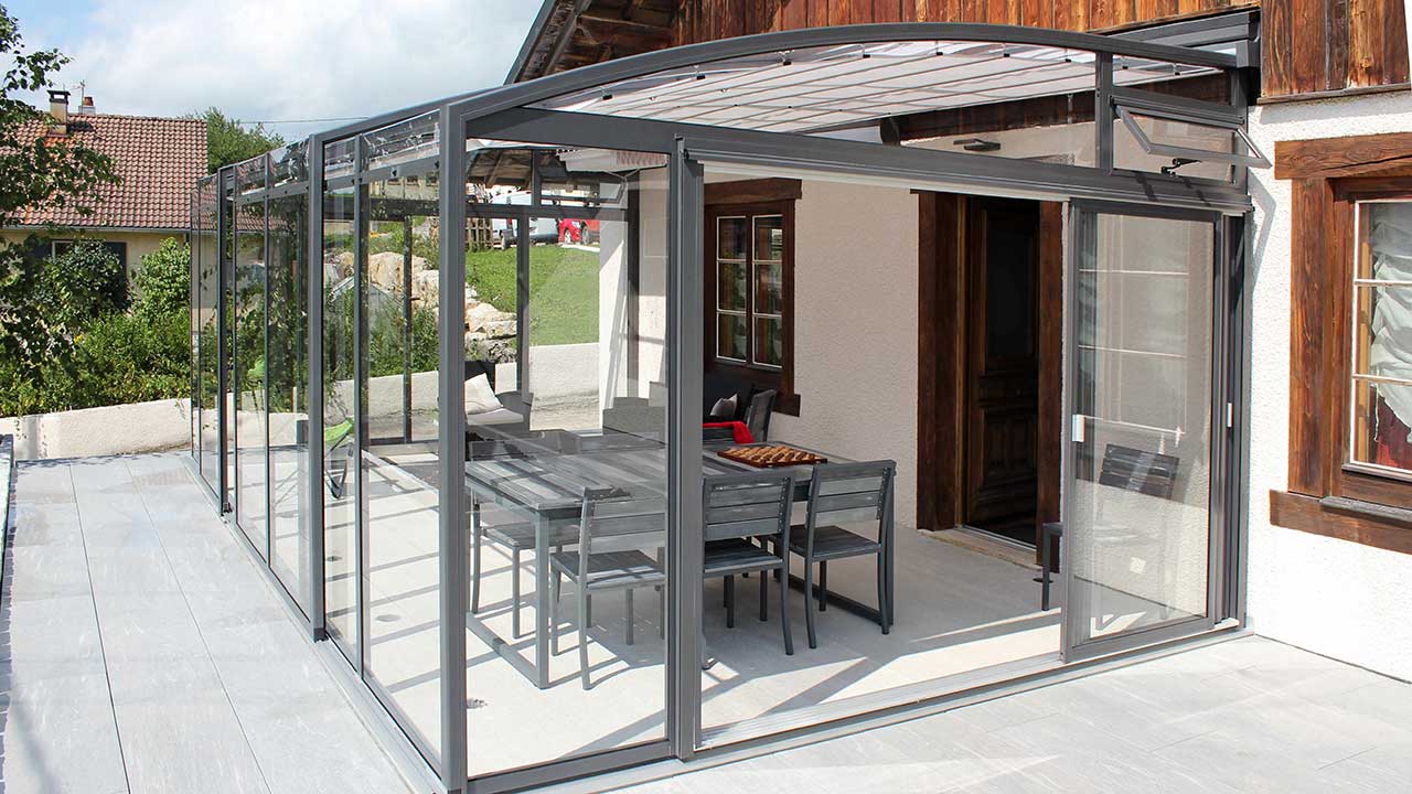 Thanks to its transparency, the TOPAS sliding patio cover offers a panoramic view of the garden. Modern design meets sophisticated technical know-how: straight front combined with a curved roof thanks to a thermoformed edge.