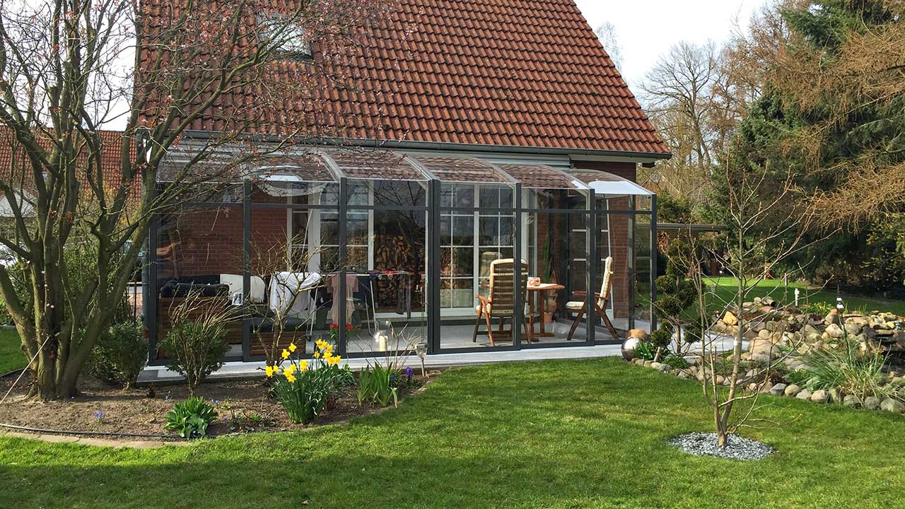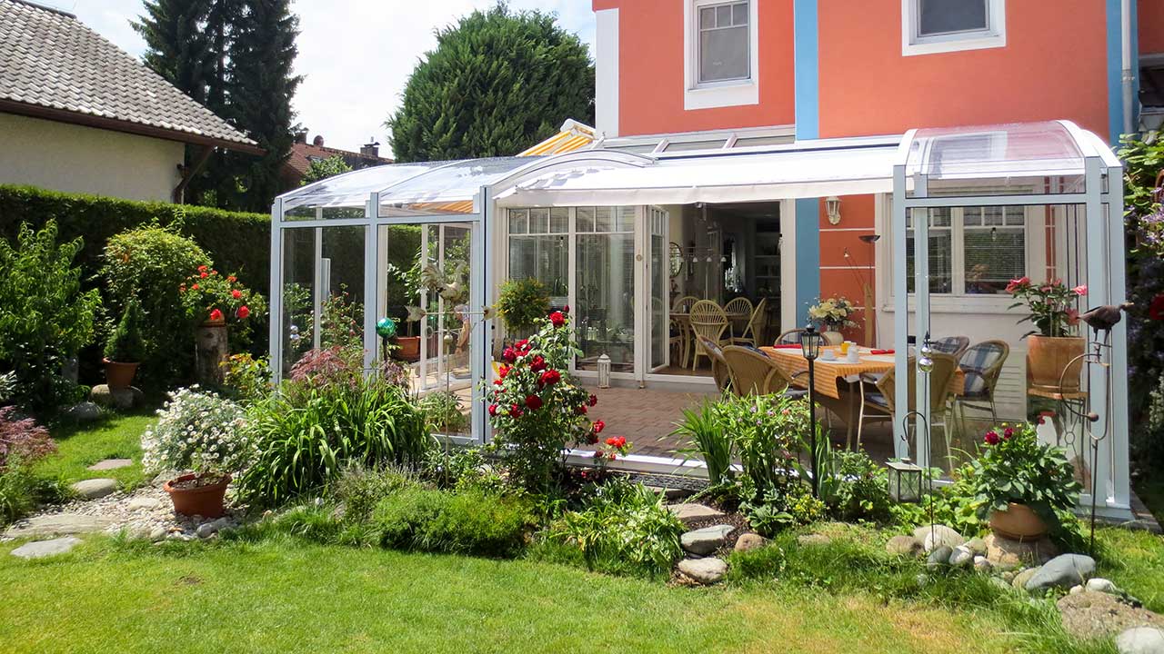 In summer, the sliding elements of the canopy are opened. The open-air patio is thus preserved. You are completely independent of the weather and can enjoy even the softest rays of sunshine on your patio. Let us advise you on our innovative “convertible conservatory” without obligation. You will be surprised how easy it is to create your new relaxation space.